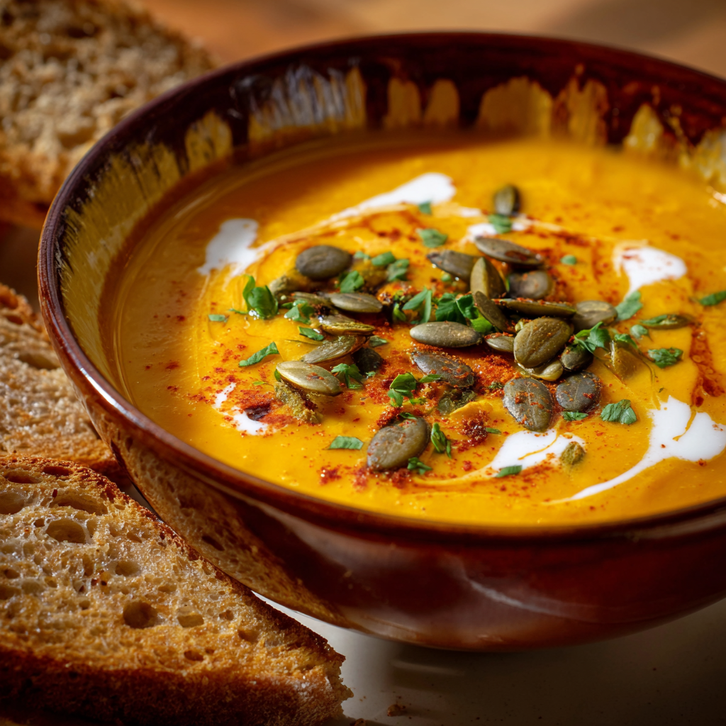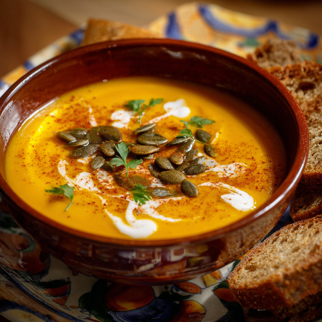 What if every spoonful of soup could taste like fall itself? 🍁 The Autumn-Spiced Roasted Pumpkin Soup captures that essence perfectly — creamy, aromatic, and infused with warm seasonal spices that make chilly days feel cozy. Made with roasted pumpkin, a hint of cinnamon and nutmeg, and a creamy finish, this soup transforms a simple pumpkin into an elegant, velvety delight.