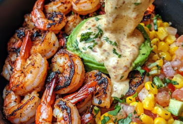 Grilled Shrimp Bowl with Avocado, Corn Salsa & Creamy Garlic Sauce