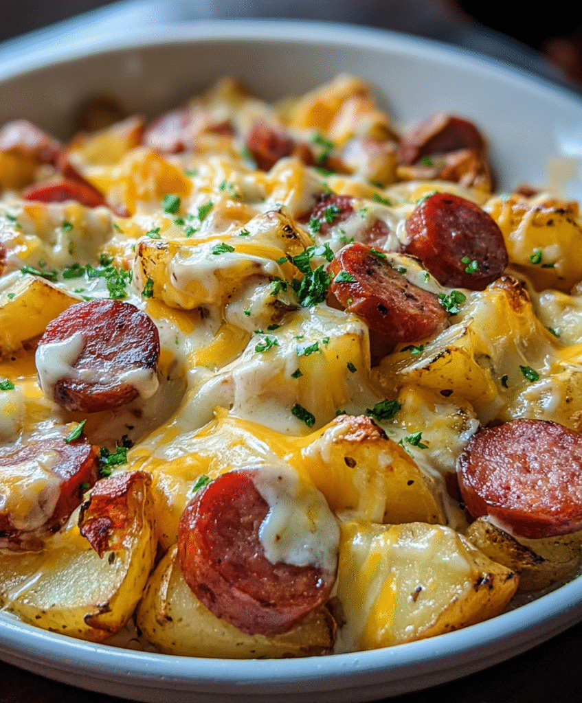 This Cheesy Ranch Potatoes and Smoked Sausage dish is the definition of easy, cheesy comfort food. 🧀🥔✨ With golden potatoes, smoky sausage, creamy ranch, and melty cheese, it’s a one-pan wonder that’s perfect for busy nights or cozy gatherings. Serve it hot, and watch everyone come back for seconds!