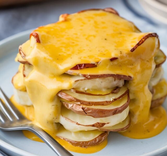 5. Layer the potatoes: Arrange half of the sliced potatoes in an even layer at the bottom of the prepared baking dish. Pour half of the cheese sauce over the potatoes. Repeat with the remaining potatoes and sauce, making sure everything is evenly distributed.