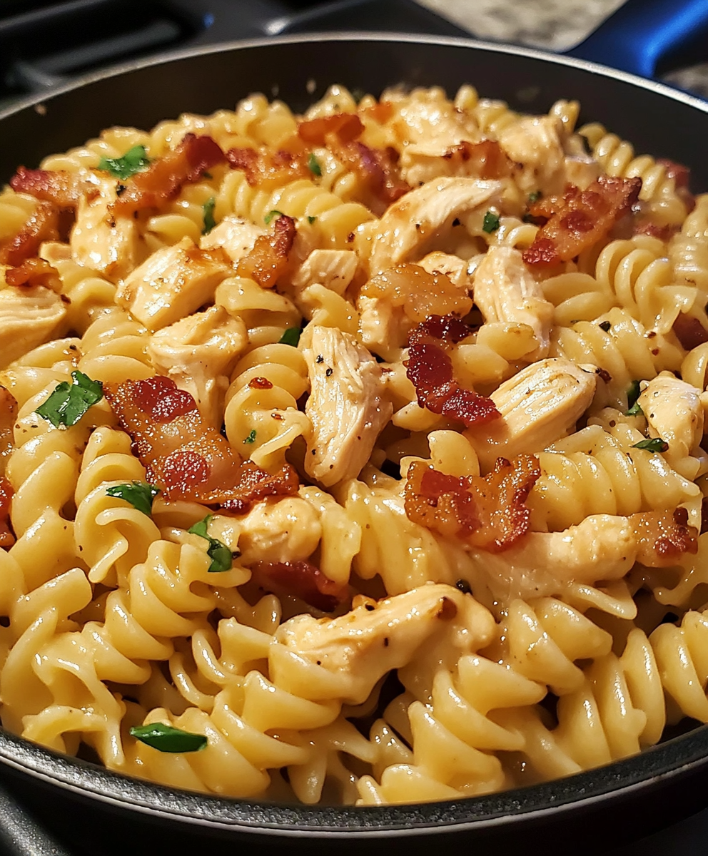 Remove from heat and fold in the crumbled bacon and chopped green onions. Serve your Chicken Bacon Ranch Pasta hot, garnished with additional green onions if desired.