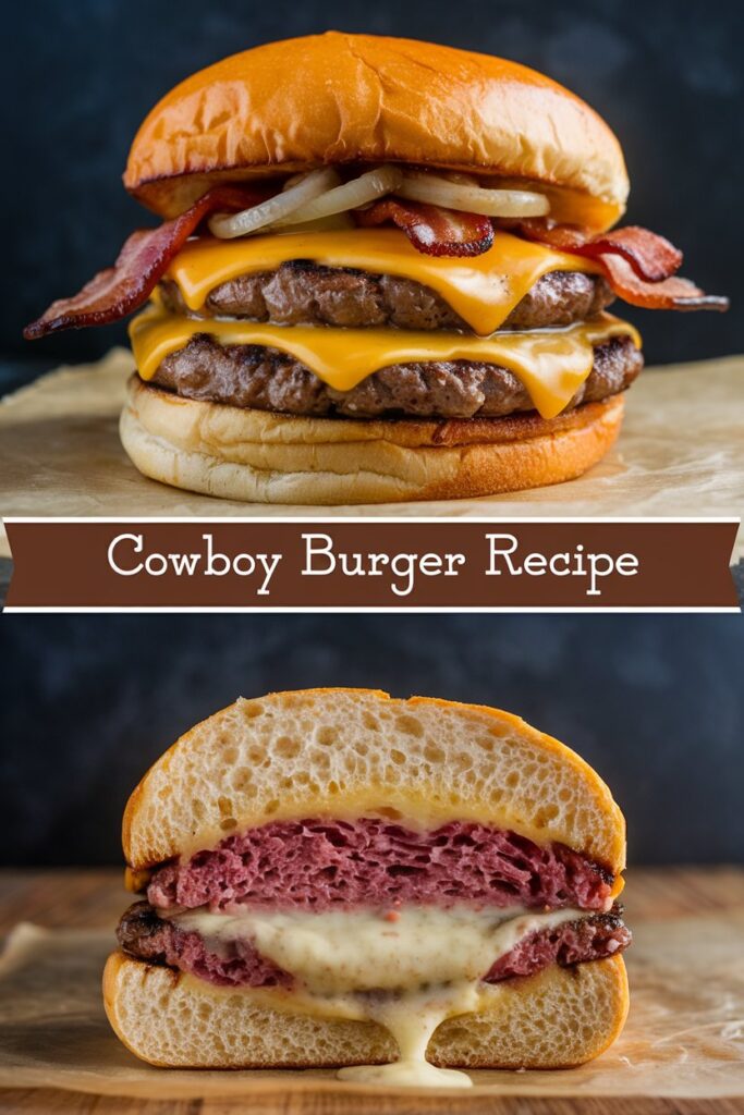 - Assemble the Cowboy Burgers: Spread a tablespoon of BBQ sauce on the bottom half of each toasted bun. Place a cheesy burger patty on top. Then, add the crispy fried onions, lettuce, tomato slices, and pickles on top of the patty.