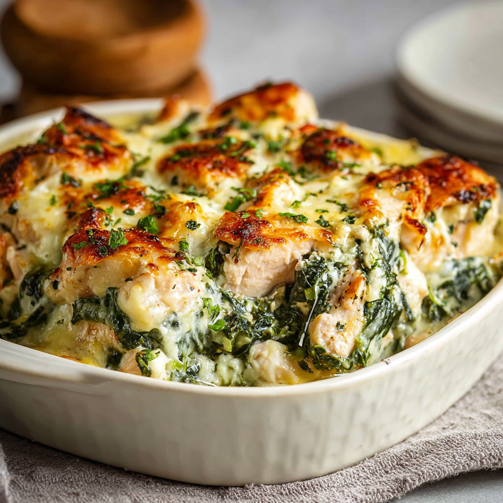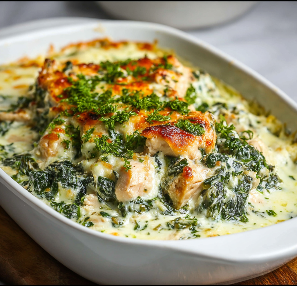 creamy chicken bake, chicken spinach casserole, baked chicken and greens, cheesy chicken spinach dish, chicken and spinach pasta bake, comfort casserole recipe, oven-baked chicken dinner.
