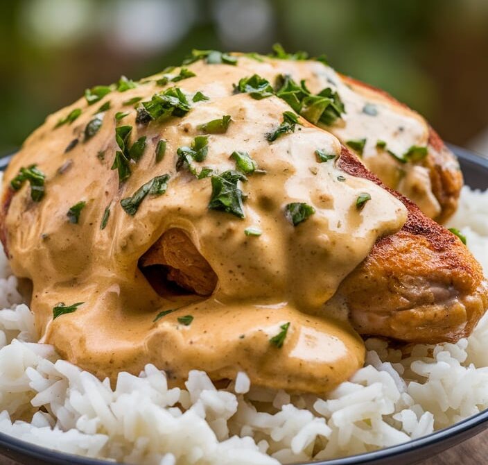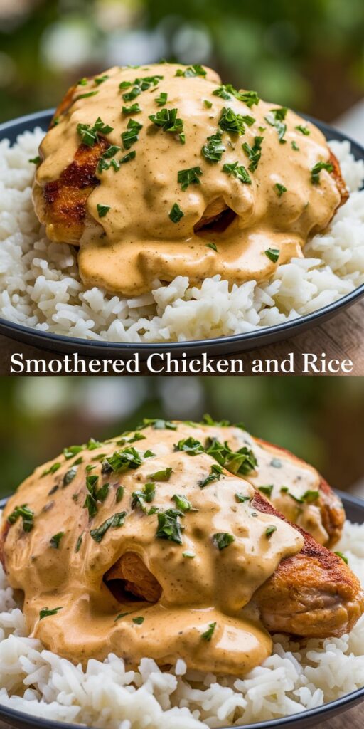- Serve: To serve, place a bed of cooked rice on each plate. Top with the creamy smothered chicken and drizzle the sauce over the top. Garnish with fresh parsley or thyme for added color and flavor.