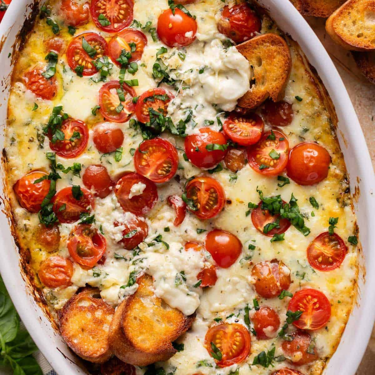 Can I make Easy Caprese Dip ahead of time? Yes! You can prepare the dip up to the baking stage and refrigerate it covered for up to 24 hours. When ready to serve, let it sit at room temperature for 15 minutes, then bake as directed, adding an extra 5 minutes to the baking time since you’re starting with a chilled dip.
