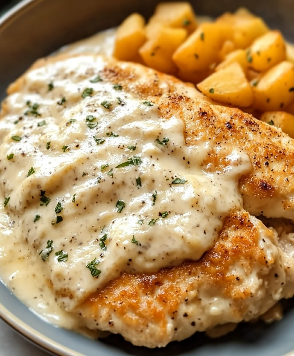 Return the seared chicken to the skillet, spooning the creamy sauce over the top. Let it simmer for an additional 2 minutes to heat through. Serve hot, garnished with extra Parmesan cheese if desired.