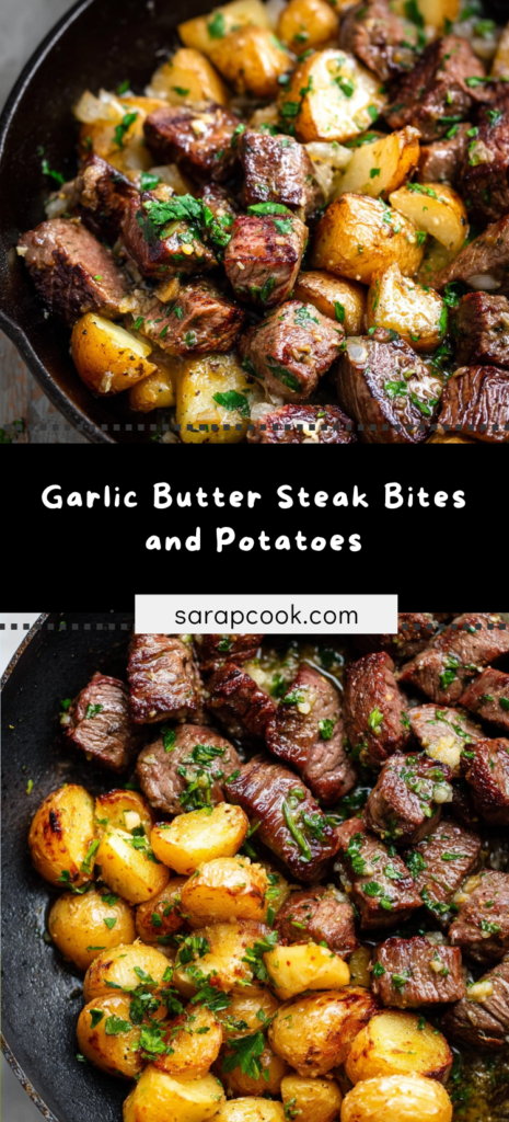 This Garlic Butter Steak Bites and Potatoes skillet is the ultimate comfort food shortcut. Juicy beef, crispy potatoes, and rich garlic butter—all ready in one pan in just 30 minutes.
