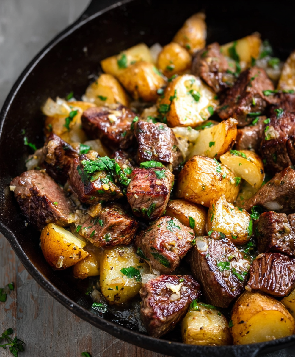 Return steak and potatoes to the skillet. Toss everything together in the garlic butter sauce. Cook for 2–3 more minutes until heated through. Garnish with fresh parsley and serve hot.