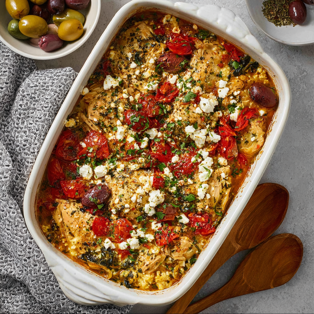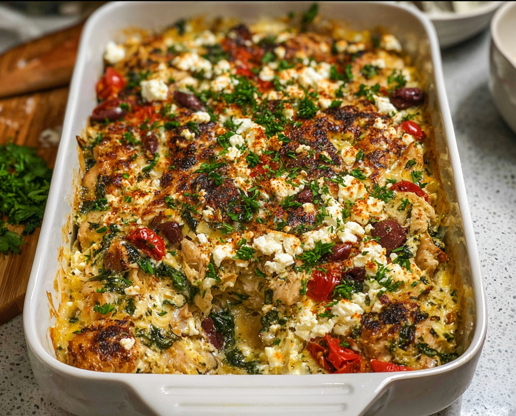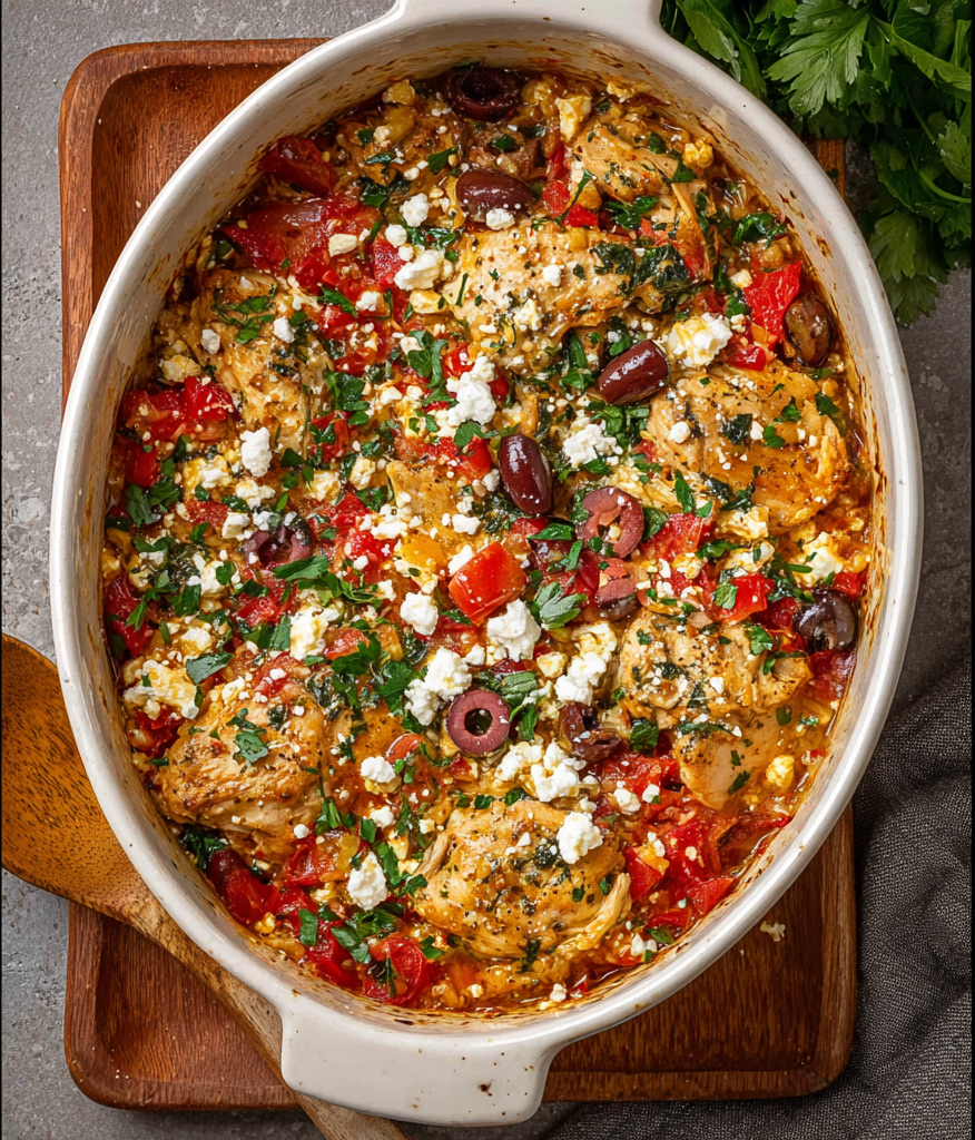 This Greek Chicken Casserole is a delicious Mediterranean-inspired dish that brings the sunshine of Greece straight to your dinner table. 🇬🇷☀️ Tender chicken, juicy tomatoes, kalamata olives, and creamy feta cheese come together in a comforting one-pan bake bursting with fresh herbs and tangy flavors. It’s wholesome, colorful, and easy enough for weeknights yet elegant enough for guests. According to recipe trend data, Mediterranean casseroles have become increasingly popular — with searches up by 35% in the last year, thanks to their focus on fresh ingredients and balanced nutrition.