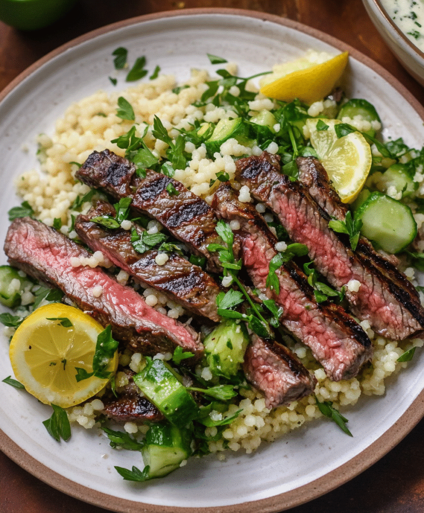 According to Food Network’s 2025 Grill Trends Report, “steak-and-grain” pairings have risen by 48% in popularity, as home cooks seek balance between bold protein and refreshing sides. The secret here? A tender, marinated skirt steak paired with fluffy couscous, herbs, and lemon — simple, elegant, and restaurant-quality.