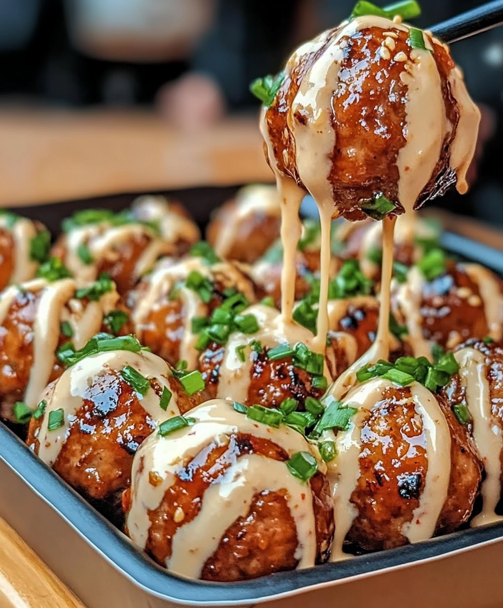 Arrange meatballs on a platter, drizzle or dip with spicy mayo, and garnish with sesame seeds and extra green onions if desired.