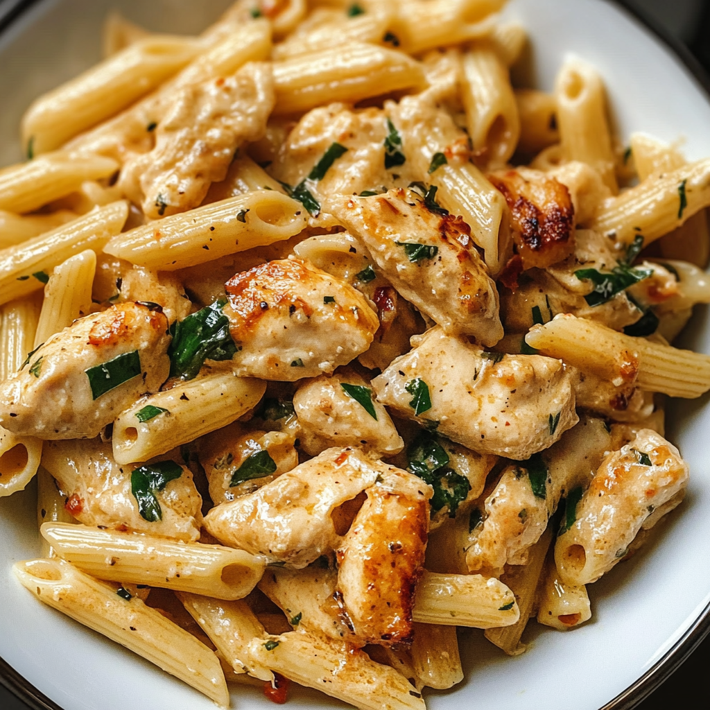 Slice chicken and return to the skillet. Add cooked pasta and toss everything together until well coated. If the sauce is too thick, add a splash of the reserved pasta water. Garnish with fresh basil or parsley.