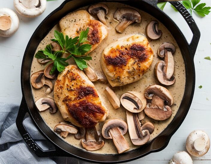 - Once the chicken is fully coated in the creamy mushroom sauce, remove from the heat. Garnish with fresh parsley and grated Parmesan cheese, if desired.