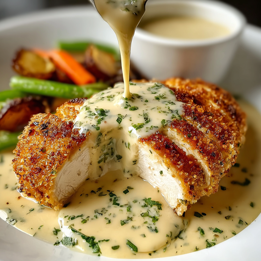 This Parmesan-Crusted Chicken with Creamy Garlic Sauce is rich, flavorful, and restaurant-worthy — yet simple enough for everyday cooking. Its crispy exterior and silky sauce make it a crowd-pleaser every time.