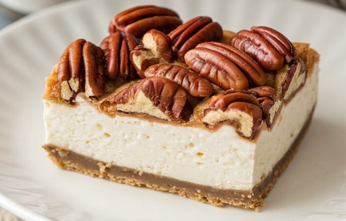 - Top with pecan mixture: Pour the pecan topping evenly over the cheesecake layer. Return the bars to the oven and bake for an additional 15-20 minutes, or until the topping is bubbly and the center is set.