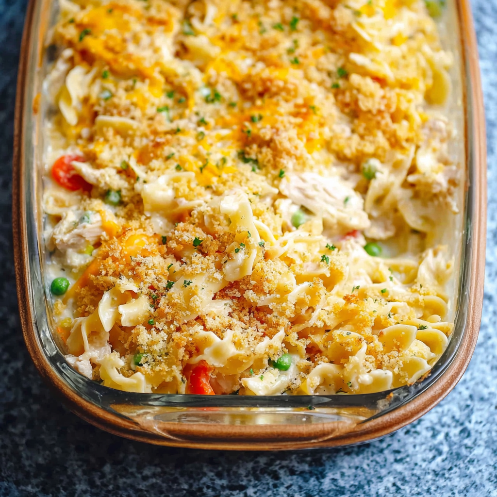 chicken noodle bake, creamy chicken noodle casserole, family-style casserole, classic chicken pasta bake, creamy chicken and noodles, comforting baked chicken recipe, old-fashioned chicken casserole.