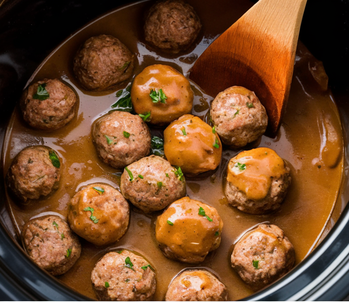 - Place the browned meatballs into the bottom of the slow cooker. Pour the gravy mixture over the meatballs, making sure they are well coated.