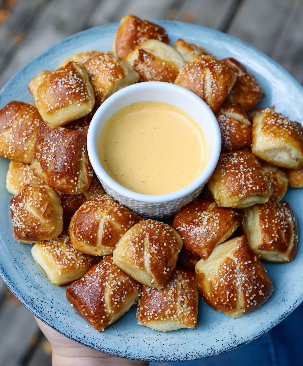 Brush warm pretzel bites with melted butter right after baking for that signature soft shine and buttery aroma.