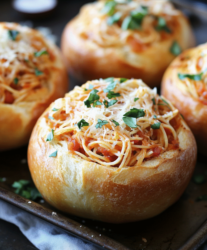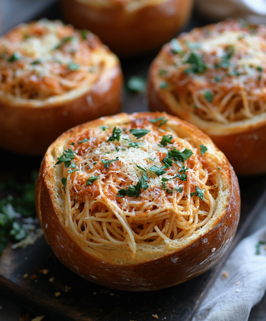 Spoon the saucy spaghetti into the toasted garlic bread bowls. Top each with shredded mozzarella and a sprinkle of Parmesan. Bake for 10–12 minutes, or until the cheese is bubbly and golden.