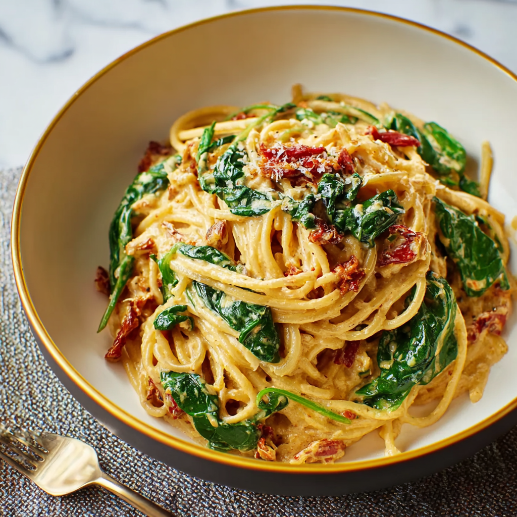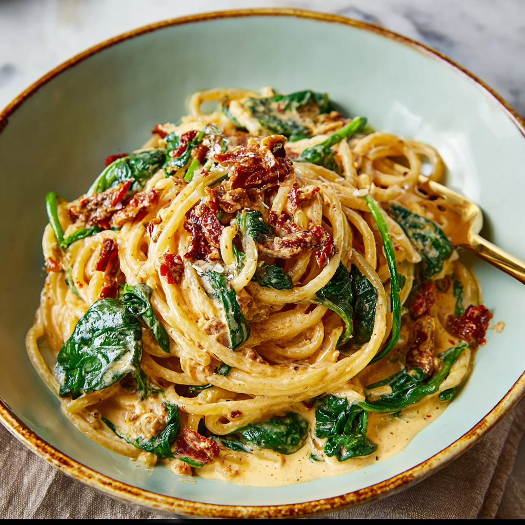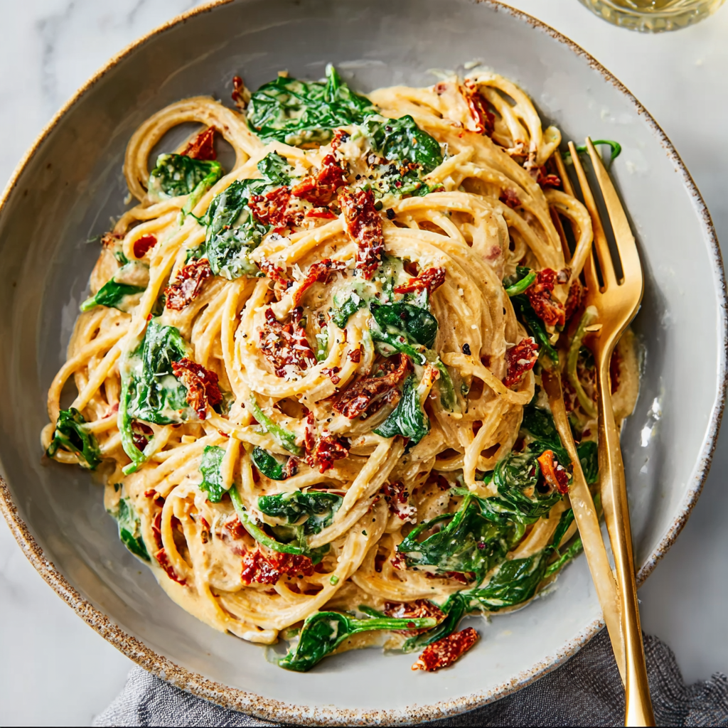 This Spaghetti & Spinach with Sun-Dried Tomato Cream Sauce is rich, creamy, and loaded with flavor — the perfect pasta for a cozy night in or a simple yet impressive dinner.