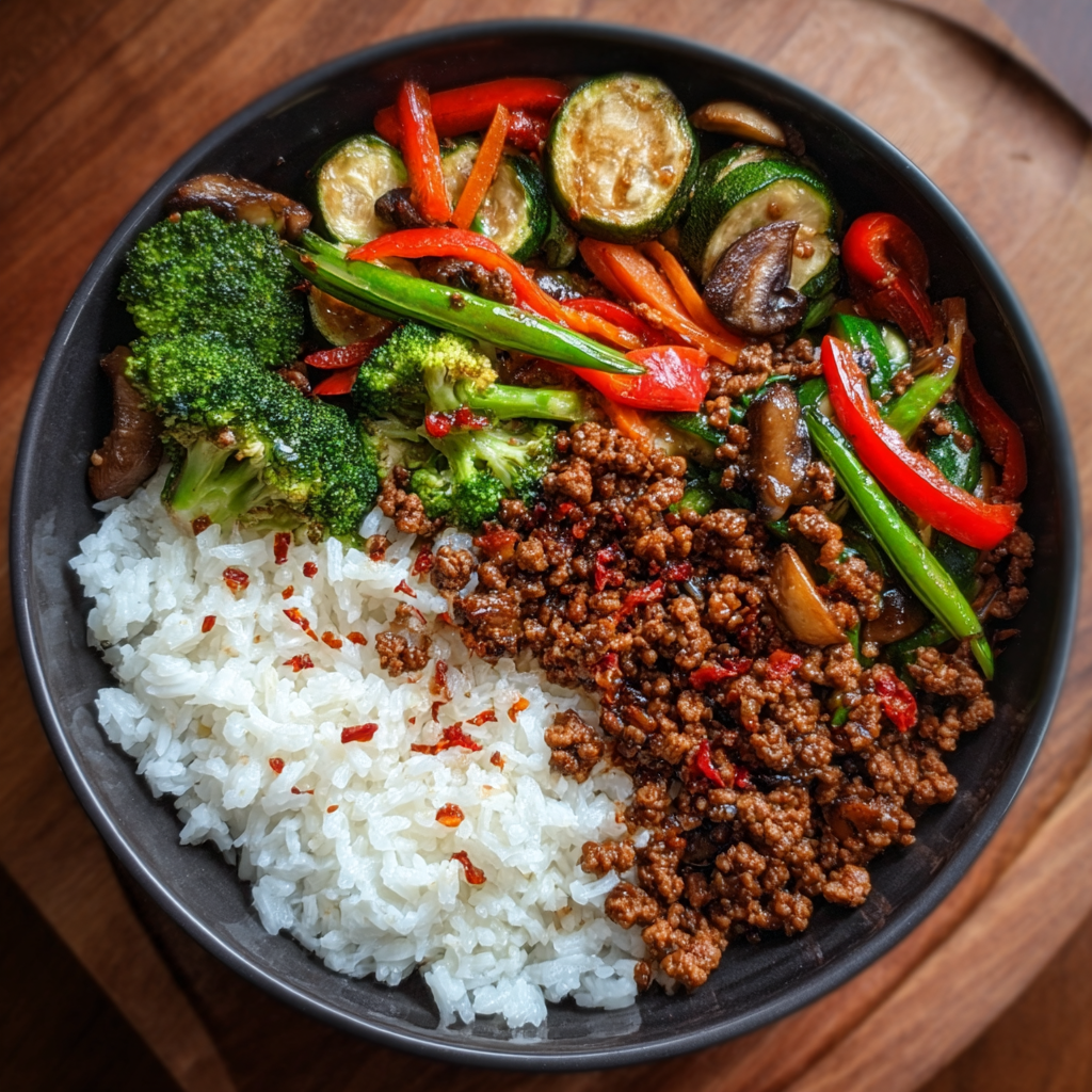 Spicy Ground Beef Stir-Fry Bowl with Garlic Veggies & Steamy Rice