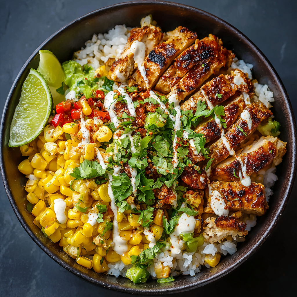 - Assemble bowls: add rice as the base, top with chicken, street corn mixture, and garnish with jalapeño slices and extra cilantro.
