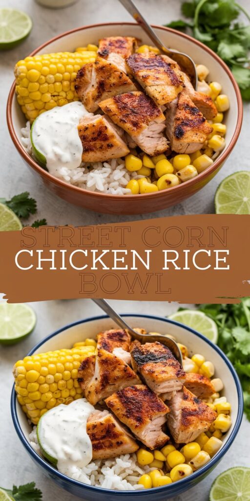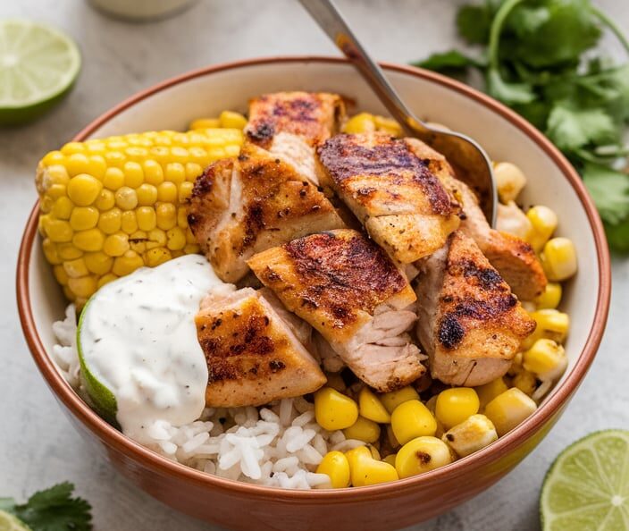 - Build the bowls: Start by adding a scoop of seasoned rice to each bowl. Top with sliced chicken, street corn, and a sprinkle of fresh cilantro.