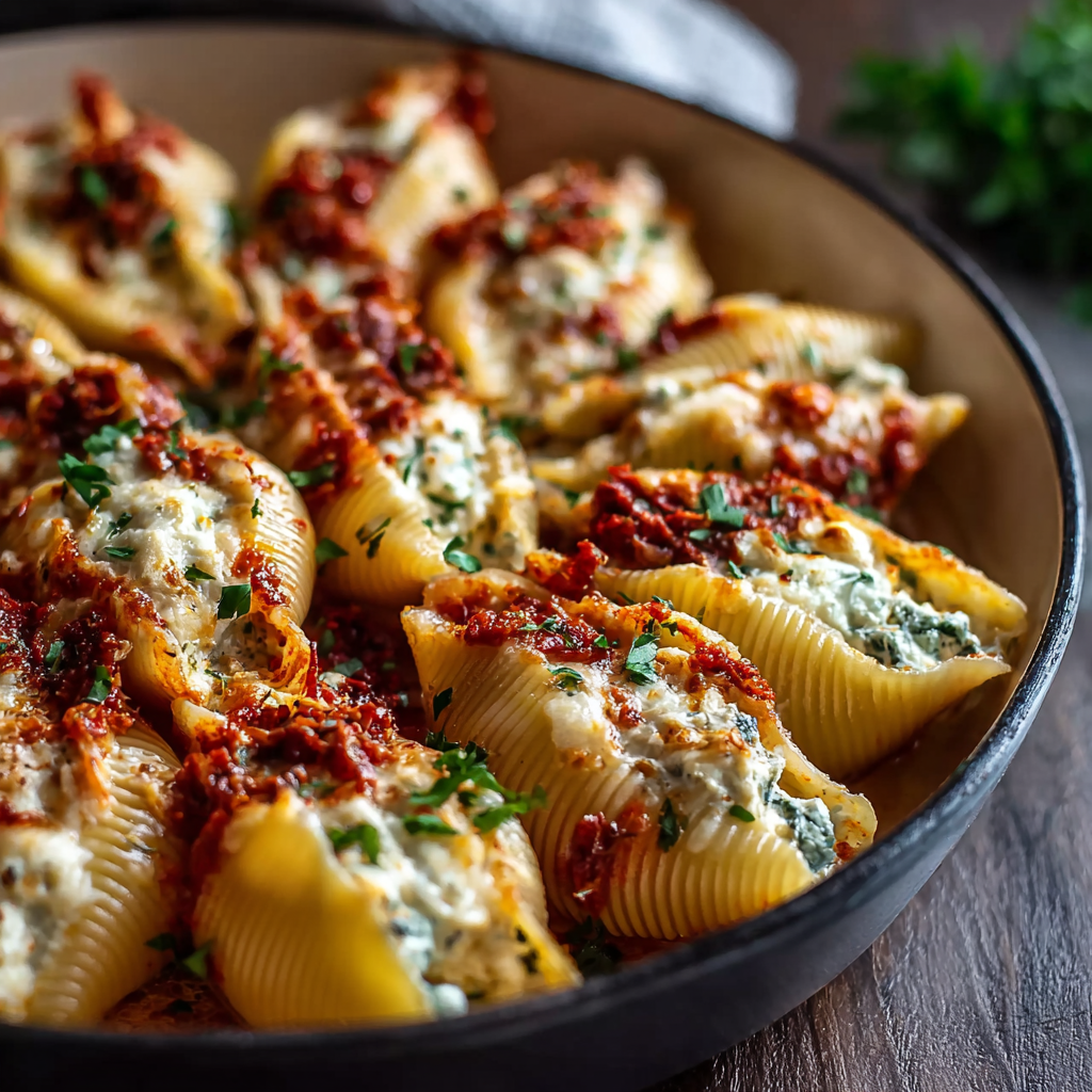 Creamy, cheesy, and bursting with Italian flavor โ these Sun-Dried Tomato Ricotta Stuffed Shells are a restaurant-quality meal made easy at home. ๐ฎ๐นโจ Perfectly cooked pasta shells are filled with a rich blend of ricotta, mozzarella, parmesan, and tangy sun-dried tomatoes, then baked in a savory tomato sauce until bubbling and golden. Itโs the ultimate comfort food that feels both rustic and elegant. According to recent food trends, baked pasta recipes have seen a 50% rise in popularity, proving that cozy, cheese-loaded dishes never go out of style.