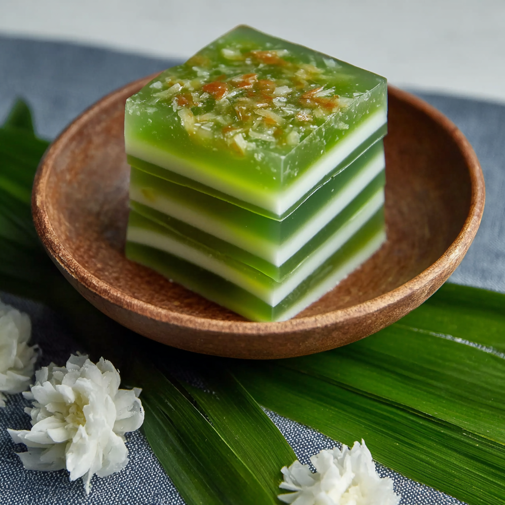 Pandan, known as the “vanilla of Southeast Asia,” brings a floral, grassy aroma with soft vanilla tones, while coconut milk adds gentle creaminess. When layered, they create a beautiful two-tone jelly with silky, bouncy texture — like a softer, meltier gummy.